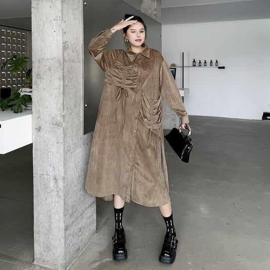 【ワンピース】韓国風 コーデュロイ×切替 フリンジデザイン 長袖ワンピース ゆるシルエット【JZシリーズ】