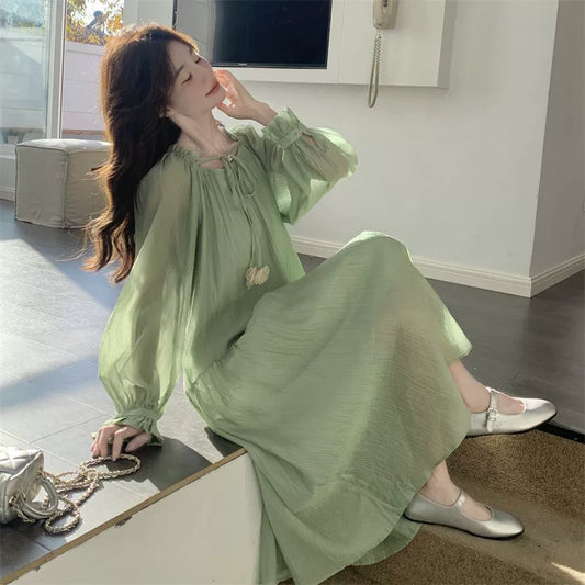 【ワンピース】グリーン フレンチ風ロマンティックワンピース新作 長袖 絶美ロングドレス【JZシリーズ】