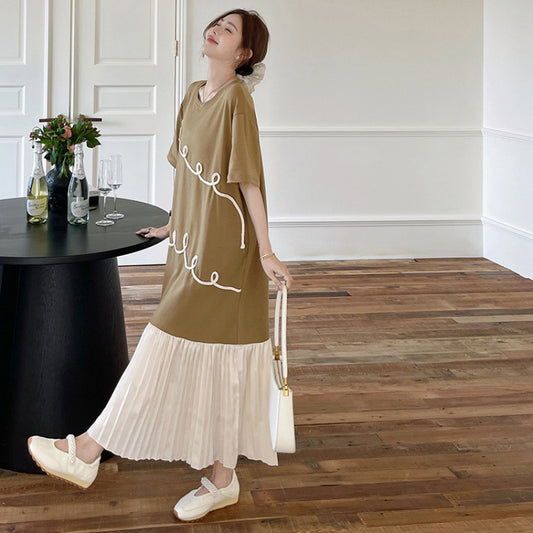 【ワンピース】☀️夏 新作 大きいサイズ レディース プリーツスカート 刺繍入り 重ね着風 半袖ワンピース ゆったり 体型カバー【JZシリーズ】