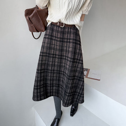 【ボトムス】レトロ チェック柄 レディース 冬用 ハイウエスト ボリューム フレア Aライン スカート【JZシリーズ】