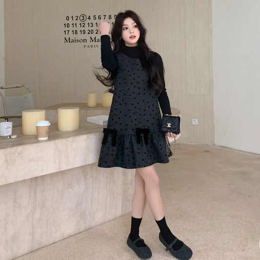 【セットアップ】気品ある リボン×ドット柄 ベストワンピース + インナー トップス2点セット レディース【JZシリーズ】
