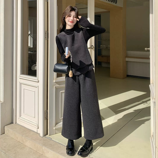 【セットアップ】上品スタイル ニットトップス+ベスト+クロップド丈 ワイドパンツ 細見え 3点セット レディース【JZシリーズ】