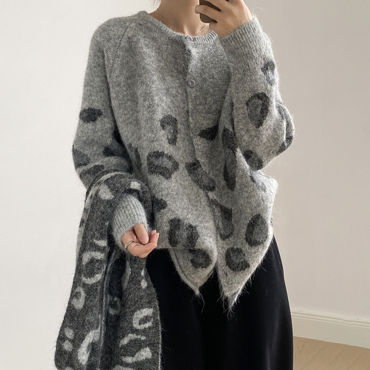 【トップス】ゆるニット レオパード柄カーディガン マフラー付き 秋冬 暖かい おしゃれ レディース【JZシリーズ】