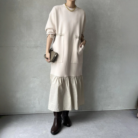 【ワンピース】フレンチレトロ 切替デザイン 大ポケット 長袖 ワンピース 秋新作 ゆったり 【JZシリーズ】