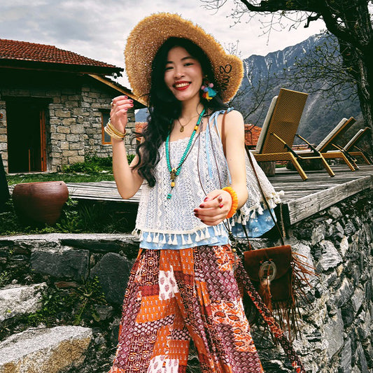 【単品注文】【セットアップ】夏新作 民族風タンクトップ+花柄ハイウエストスリットワイドパンツ 上下セット【SHシリーズ】