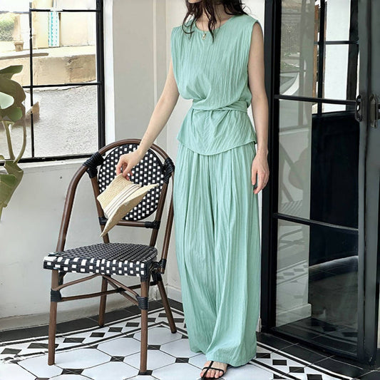 【単品注文】【セットアップ】無地 夏 プリーツノースリーブ ブラウス + ゆったり パンツ 上下セット