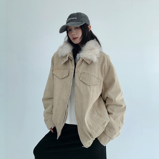 【アウター】秋冬用 高級感 フェイクボア デニムジャケット レディース ビッグカラー 綿入れコート【SNシリーズ】