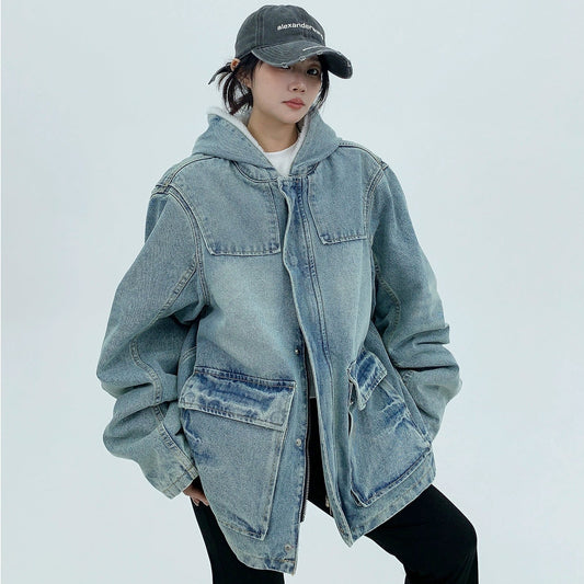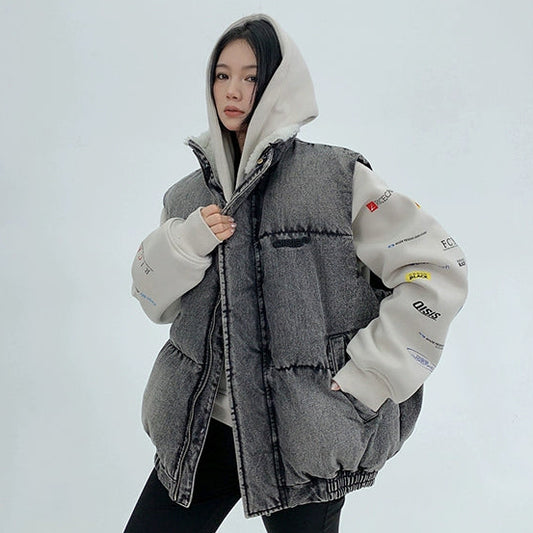 【アウター】韓国系 ヘビーウェイト ニッチ ダメージ加工 デニム ゆったり 綿入れコート【FCシリーズ】