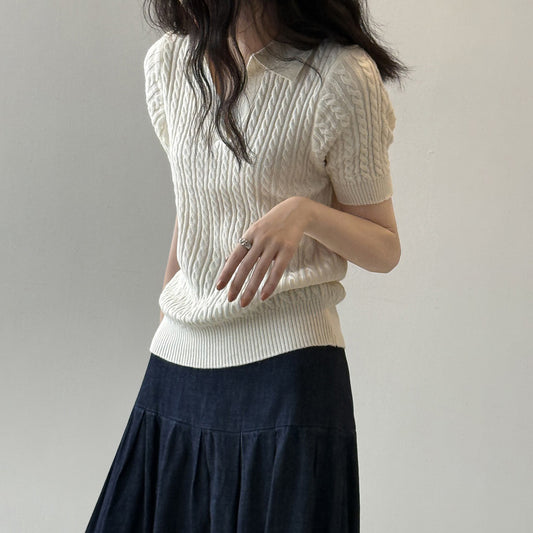 【トップス】ヴィンテージケーブル編みポロニット 半袖Tシャツ レディース 秋 Vネック スリムショート丈トップス【JZシリーズ】