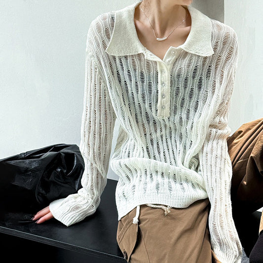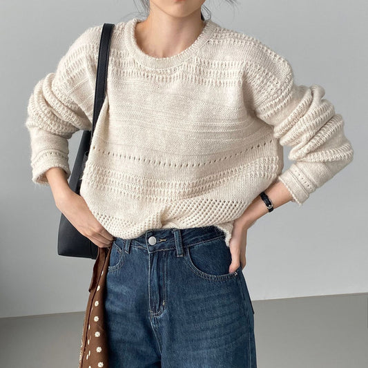 【トップス】美白見え 韓国風 ニットトップス レディース 透かし編み クルーネック ゆったり カジュアル着回し【JZシリーズ】