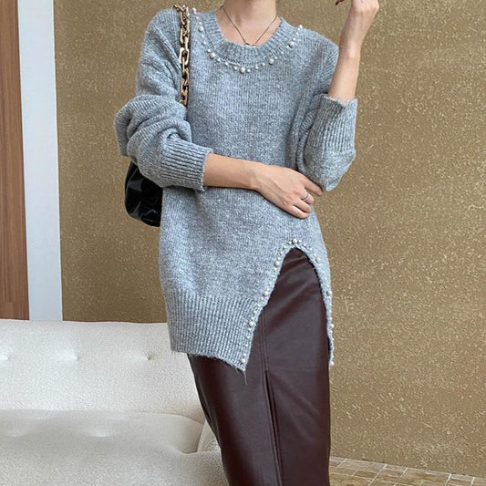 【トップス】秋冬 スリット 無地 ラウンドネック 厚手 セーター