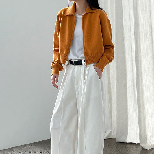 【トップス】春 秋 冬 ショート丈 ダブルジップ ニットカーディガン ポロカラー セーター 【JZシリーズ】
