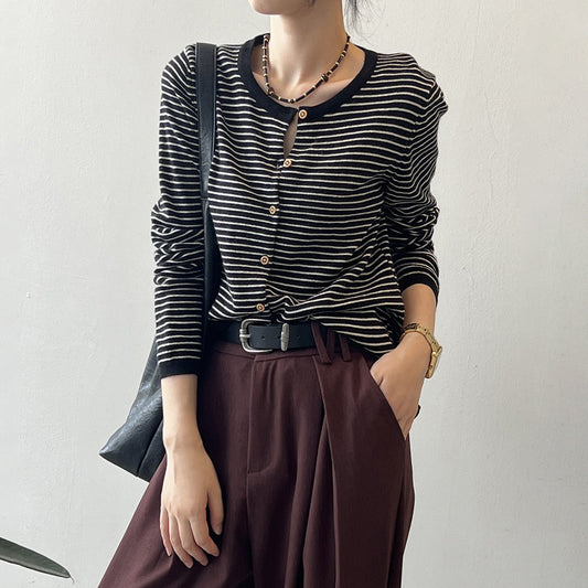 【トップス】バイカラーストライプが映える!韓国風薄手ニットカーディガン|体型カバーも叶う秋トップス【JZシリーズ】