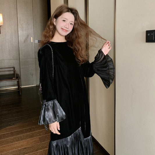 【ワンピース】春 秋 冬 デザイン性 ベルベット フリル 着痩せ 長袖ワンピース【JZシリーズ】