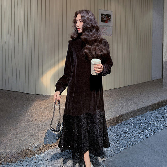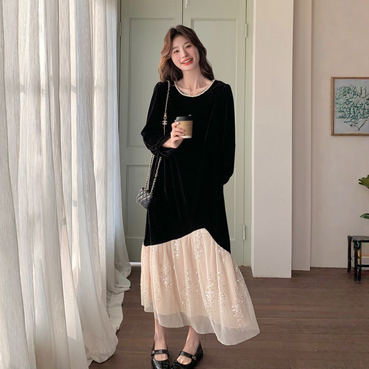 【ワンピース】春 秋 冬 ブラックベルベット スパンコール切り替え アシンメトリーマーメイド ワンピース 【JZシリーズ】