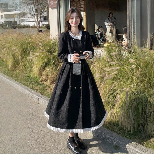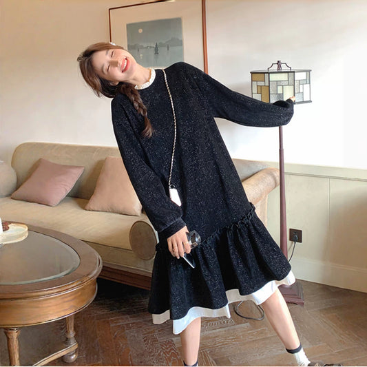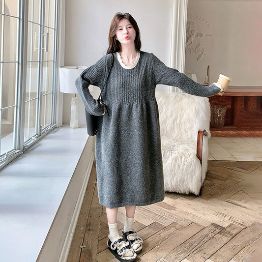 【ワンピース】韓国風 上品かわいい ニットレース切り替え 長袖ワンピース レディース 秋冬ミドル丈【JZシリーズ】