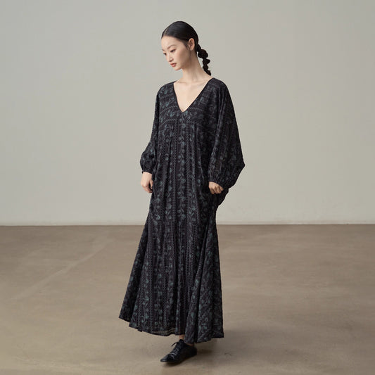【ワンピース】レトロ花柄 バットスリーブ ゆったり 長袖ワンピース Vネック 秋コーデ【SHシリーズ】