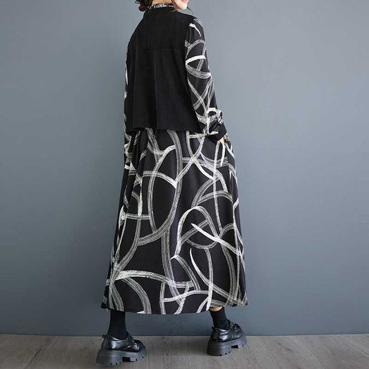 【ワンピース】春秋 個性柄 カジュアル レイヤード風 長袖ワンピース【SHシリーズ】