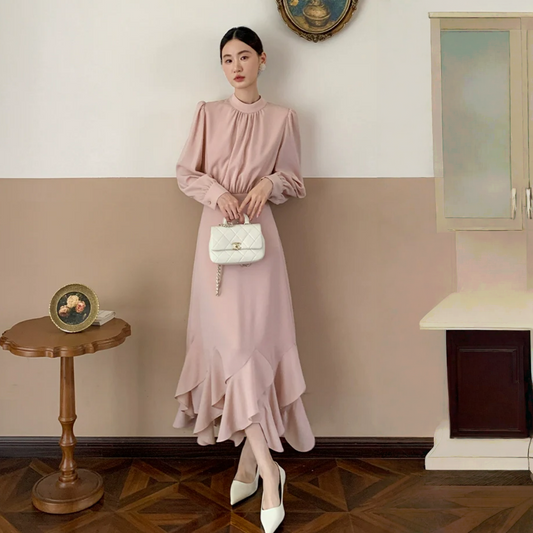 【ワンピース】フレンチ風 秋新作 優雅な気質 ミディ丈 スリム見え 長袖ワンピース【JZシリーズ】