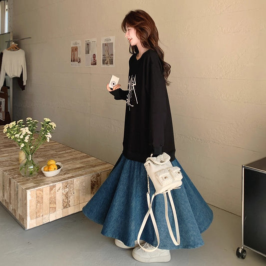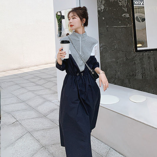 【ワンピース】レイヤード風 デニム切り替え 春秋 長袖ワンピース 爆売れ【JZシリーズ】