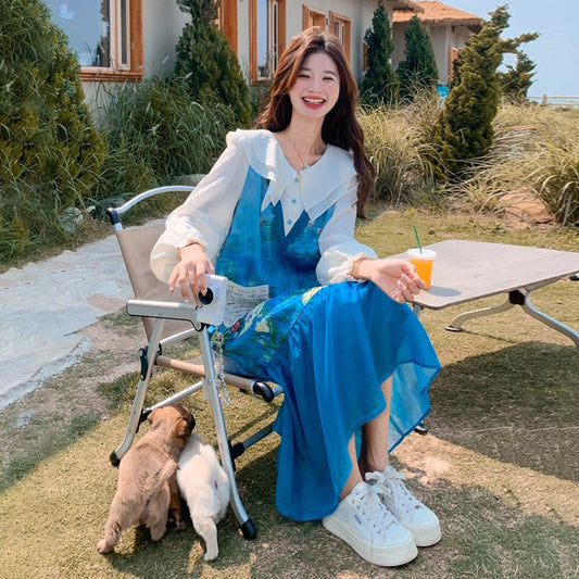 【セットアップ】ベスト付き 花柄フレア 長袖ワンピース セット 春秋 海辺リゾート 高級感【SHシリーズ】