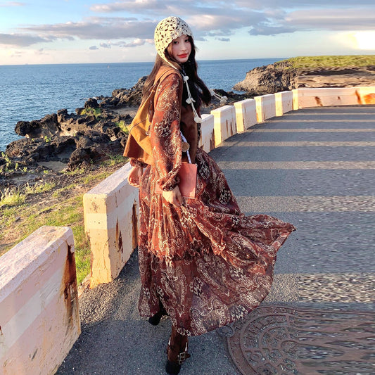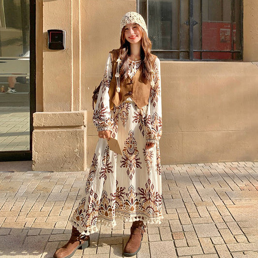 【セットアップ】ボヘミアン民族風ベスト+花柄ワンピース レディース 春秋 個性的で華やか 絶美長袖ワンピース【SHシリーズ】