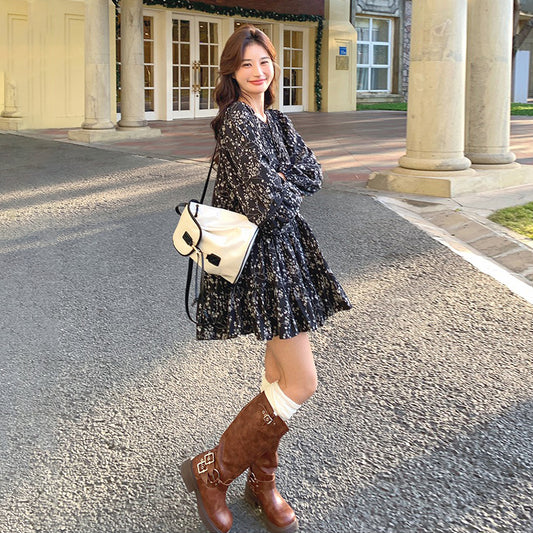 2点セット【セットアップ】PUレザーベスト+ 花柄 長袖ワンピース 2点セット レディース 春秋 高級感 韓国風 コーディネート おしゃれ【SHシリーズ】