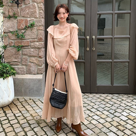 【ワンピース】レンチ風 長袖ワンピース レディース 秋新作 韓国風 優しい雰囲気 人気 気質レース ロング丈 初恋ワンピ【JZシリーズ】