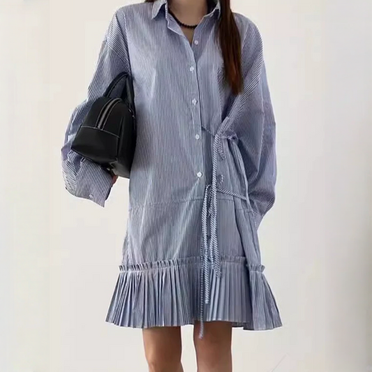 【ワンピース】春 秋 冬 サイドリボン ゆったり切替 プリーツ 長袖ストライプ ワンピース 【JZシリーズ】