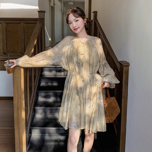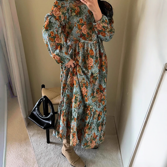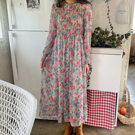 【ワンピース】春 秋 夏 レトロ ラウンドネック 花柄 長袖 ワンピース【SHシリーズ】