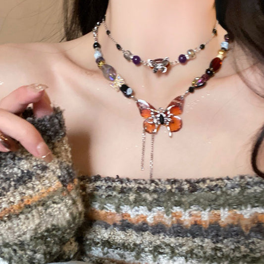 【🎁 B2G1|先行スタート!】【グッズ】レトロギャル風 バタフライ レオパード ビーズネックレス レディース 個性派 ロングネックレス チョーカー 民族風 アクセサリー