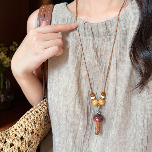 【🎁 B2G1|先行スタート!】【グッズ】 天然キノコモチーフビーズネックレス レディース 森系 ロング丈 ニットチェーン 個性派 民族風アクセサリー