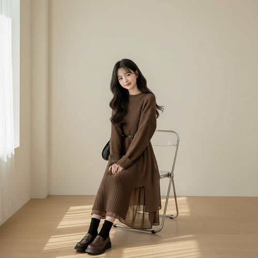 【セットアップ】透かし編みニットワンピースセット レイヤード風 レディース 韓国風 雰囲気2点セット【JZシリーズ】