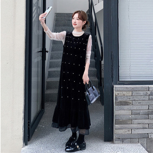 2点セット!【セットアップ】韓国風 ドット柄ウールベストワンピース+インナートップス セット【JZシリーズ】