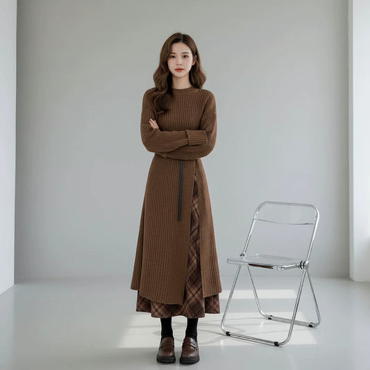 【セットアップ】春 秋 冬 ニット ワンピース+ベルト+チェック柄 スカート 3点セット 【JZシリーズ】