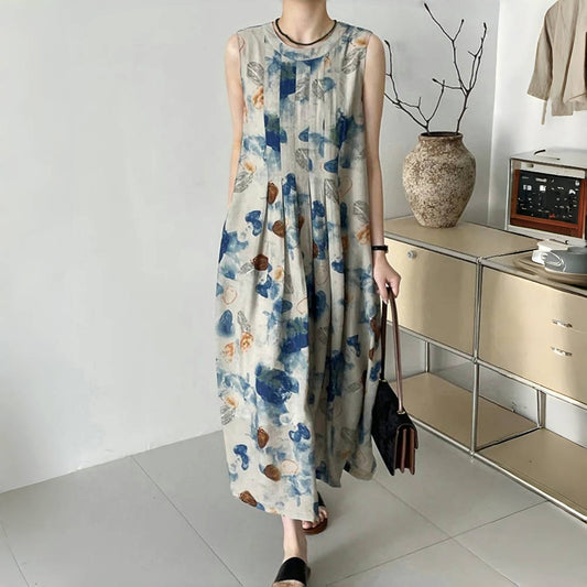【ワンピース】夏新作 水墨風グラデーション ワンピース レトロ ゆったりノースリーブロングドレス 体型カバー着痩せ【SHリーズ】