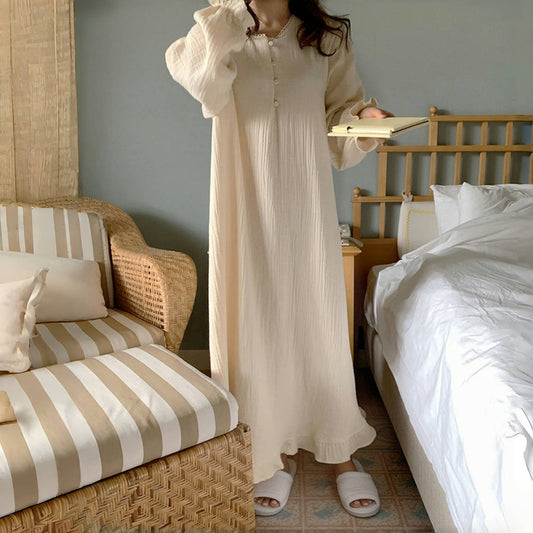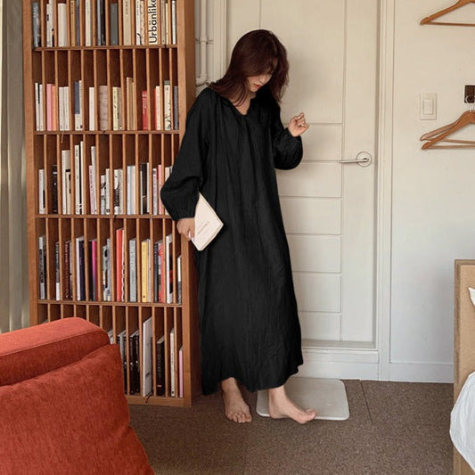 【ワンピース】夏 日系 コットン 無地 ルームウェア 長袖ワンピース
