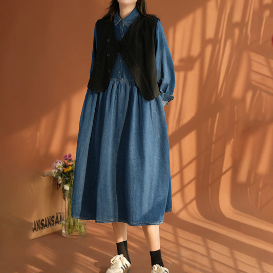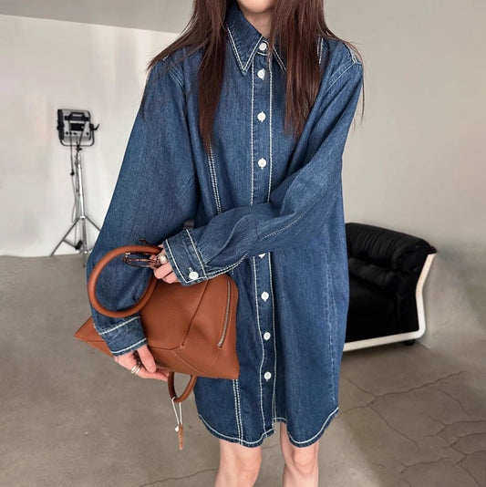 【ワンピース】春秋 高級感 レトロ ラペル ルーズ デニム 長袖ワンピース