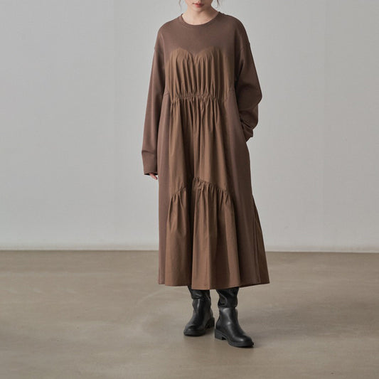 【ワンピース】chic レトロ 配色 切り替えしシャーリング 長袖ワンピース