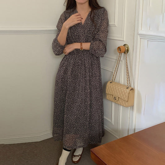 【ワンピース】春秋夏 chic 秋 レトロ Vネック 花柄 着痩せ 長袖ワンピース