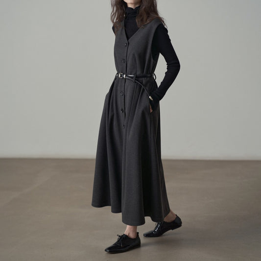 【ワンピース】春秋冬 ベルト付き 秋冬 通勤 Vネック ベストワンピ ノースリーブワンピース
