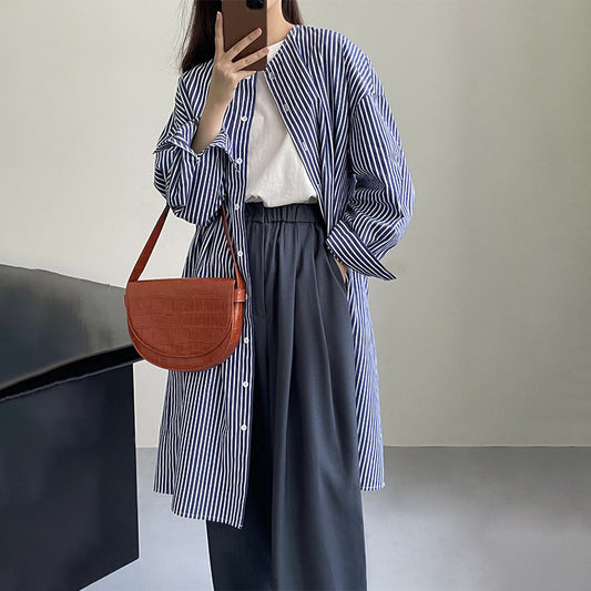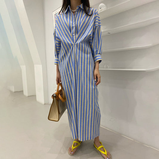 【ワンピース】夏春秋ミドル丈 ストライプ柄 ゆったり シャツ カーディガン 長袖ワンピース【JZシリーズ】