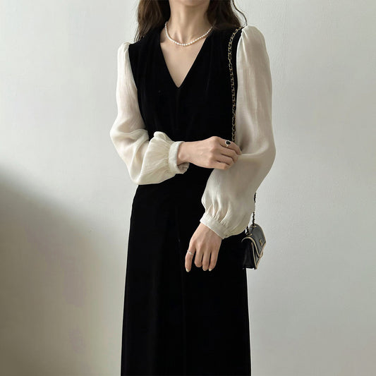 【ワンピース】春秋 気質よい Vネック ビロード生地 切り替えし長袖ワンピース【JZシリーズ】