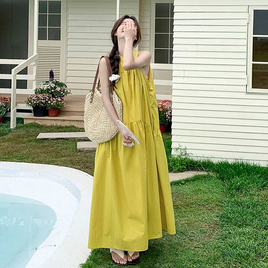 👉 翌日発送⚡在庫限り!【ワンピース】夏新作 フレンチエレガンス テンセル素材 リボンタイ ネックホルター ゆったり ノースリーブワンピース【JZシリーズ】