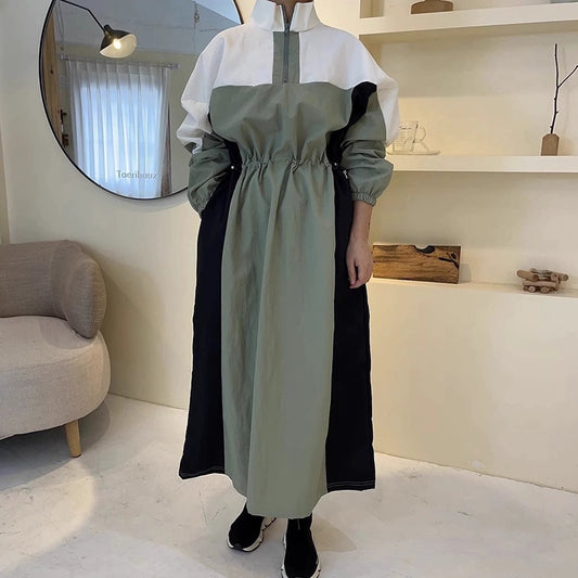 【ワンピース】春秋 韓国風 スタンドネック 切り替えし着痩せ 長袖ワンピース