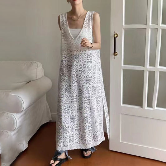 【ワンピース】夏 海辺リゾート風 レース刺繍 ロング丈 気質スタイル ノースリーブワンピース