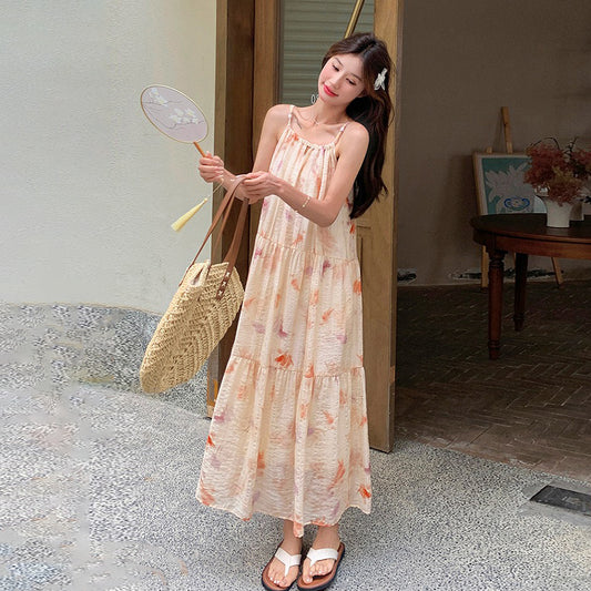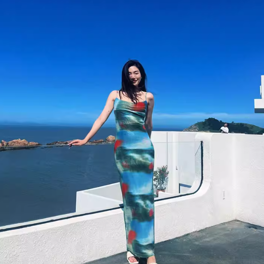【ワンピース】フレンチロマンティック 油絵風 ノースリーブキャミワンピース 夏 ビーチリゾートドレス【SHシリーズ】