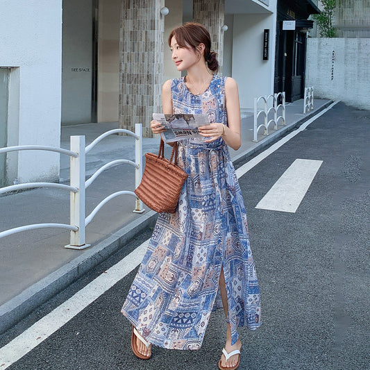 【ワンピース】海辺リゾート気質 フレンチプリント 高級感 ノースリーブワンピース【SHシリーズ】