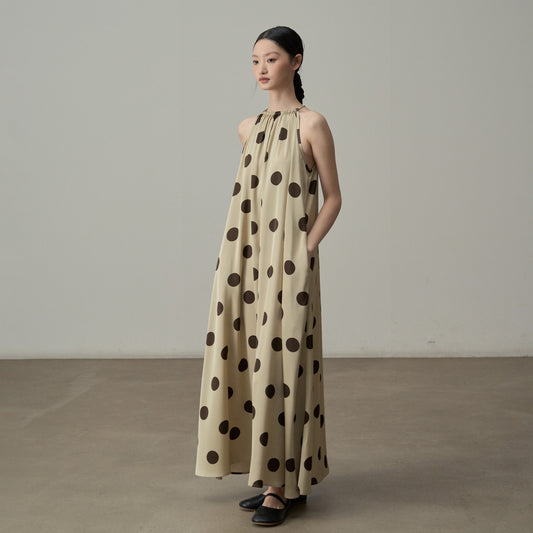 【ワンピース】レトロ リゾート風 ドット柄プリント ノースリーブワンピース レディース ゆったりスリム見え ミディ丈 ロングドレス【SHシリーズ】