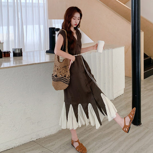 【ワンピース】フレンチ風 配色デザイン ゆったり ノースリーブワンピース レディース 夏 大人気 上品で洗練された ロングドレス【JZシリーズ】